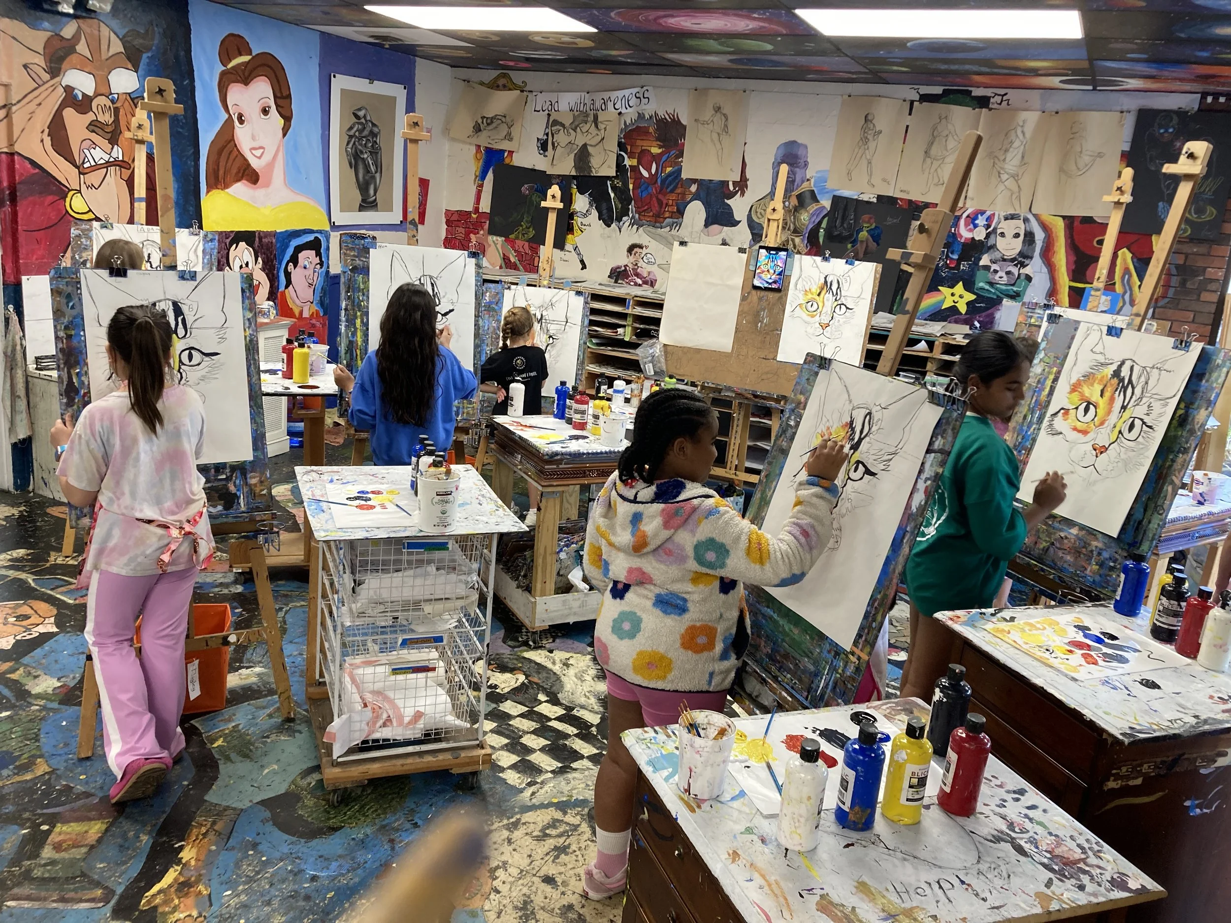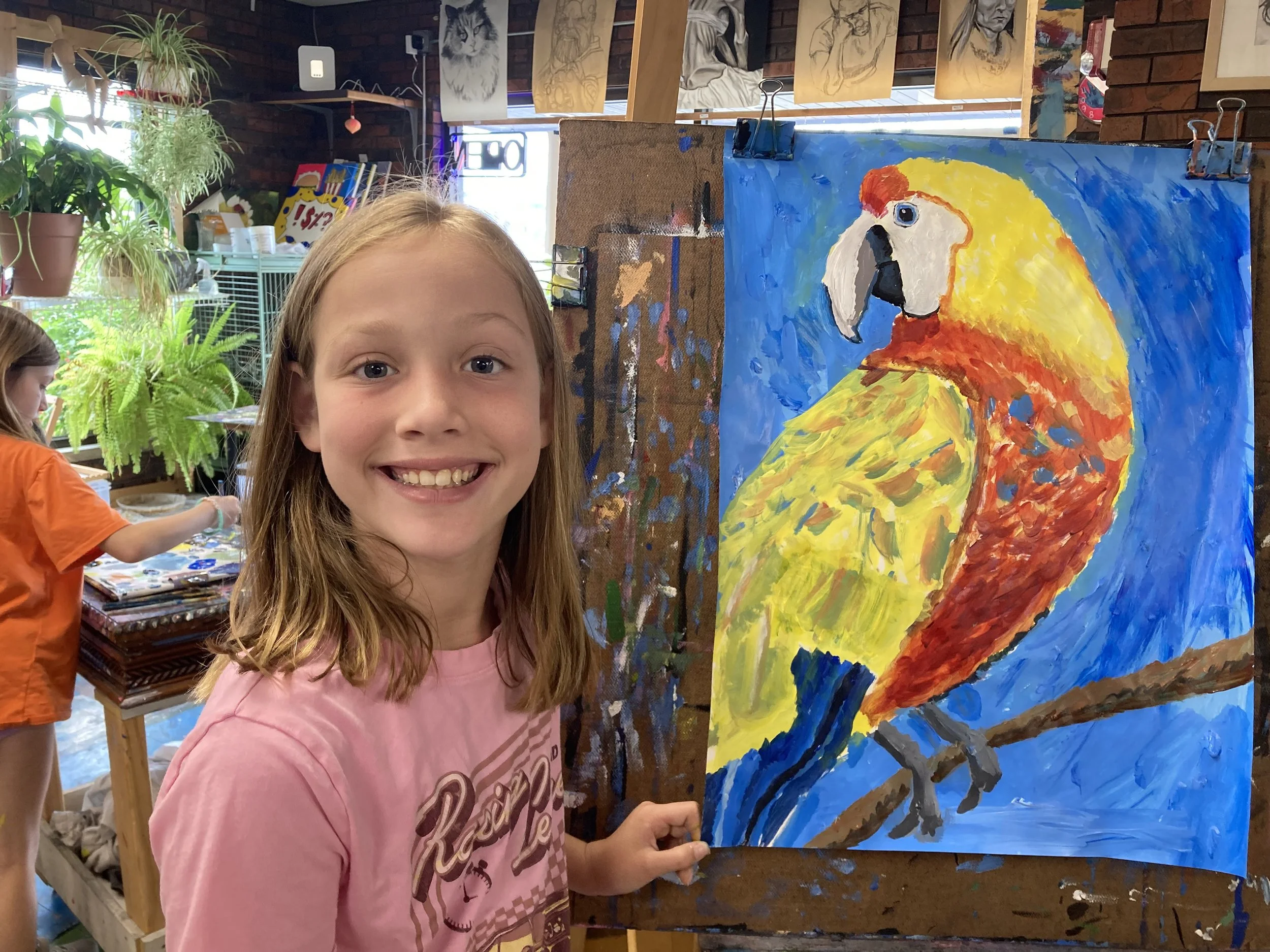 The children learn to sketch using acrylic paints and slowly we work together as a group to build up the layers. In this class I select a group of images, the kids vote on it, and by the end of the week I would say that we get through two or three paintings depending on the group of kids that sign up. Of course, the younger aged children pick age-appropriate images based on their skills and the older children select more demanding challenges. All-in-all, everyone always goes home feeling proud of what they accomplish in the week and have a blast all the way through!